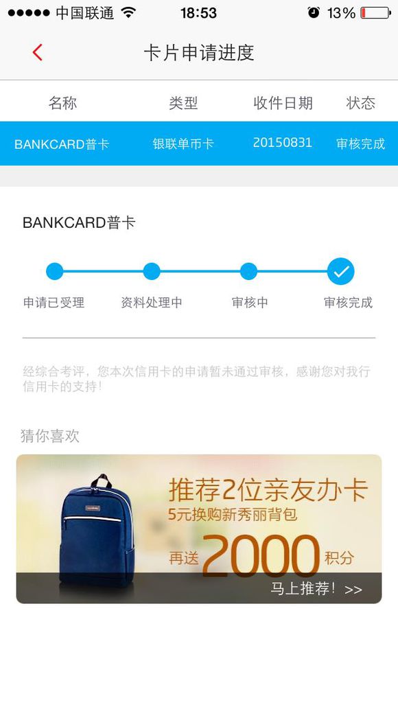 楼主,我是27号业务员上门办理的,之后就一直停在第二步,我是本科今年刚毕业的。现在在酒店里做库房管理,月薪三四千那样,业务员给添的年薪五万,应该是白户,下卡几率大吗?还有不是说第二步到第三步就三天左右吗,是不是希望渺茫啊