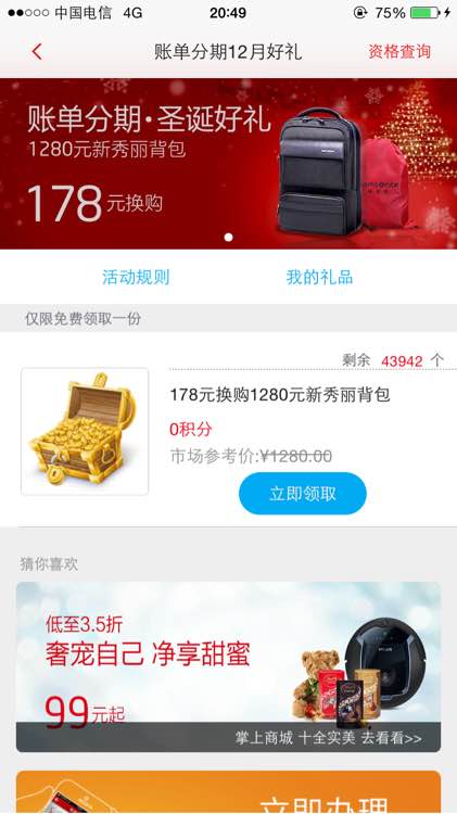 今天看见这个账单分期的活动,心动了,刚好有2万可以分期,但是这个话说价值1280的新秀丽背包1.7折购买,那T M是正品吗?值不值178元?